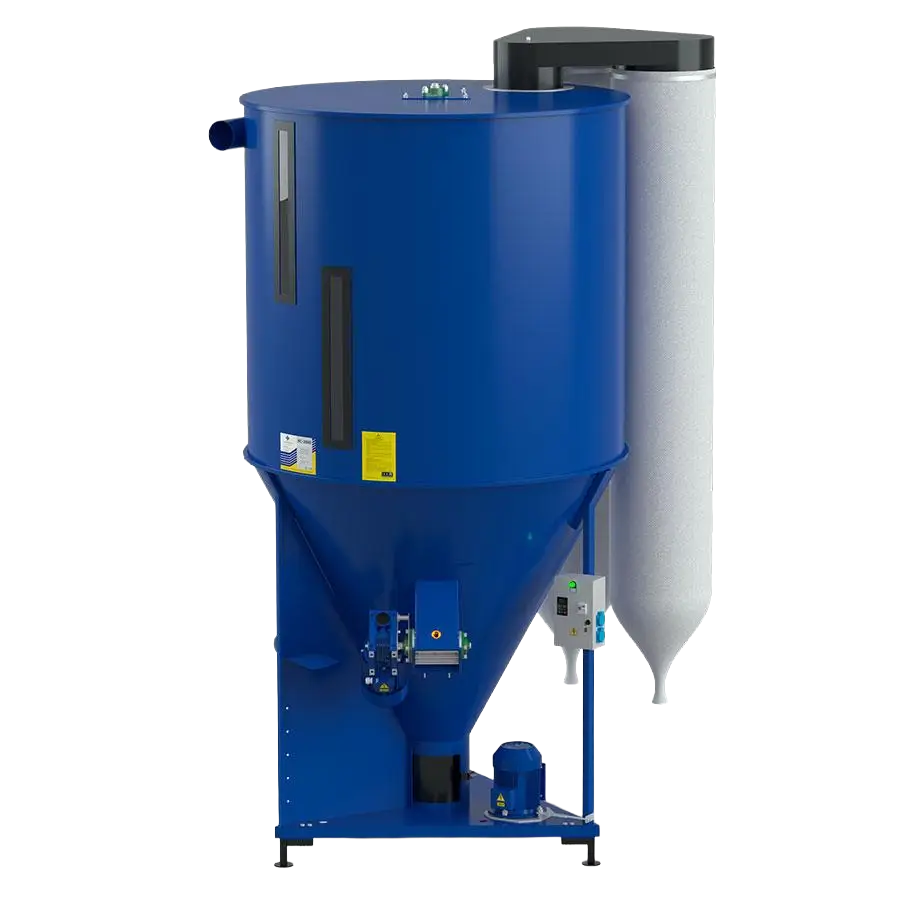 Amestecator furaje KS-1500 cu descarcare automata este un echipament profesional conceput pentru amestecarea și umezirea ușoară a componentelor vrac utilizate în producția de nutrețuri combinate. Asigură o omogenizare eficientă a furajelor datorită sistemului de amestecare vertical cu șnec.