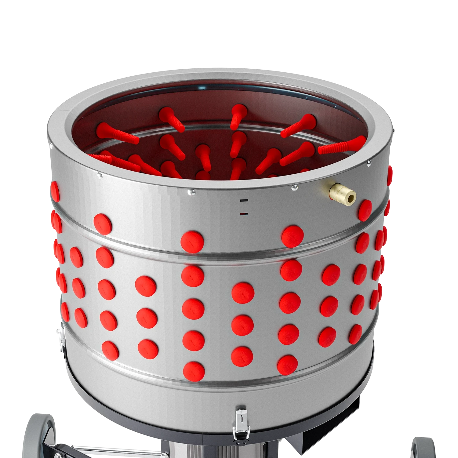 Procesul de deplumare are loc într-un tambur cilindric cu diametrul de 50 cm, echipat cu un disc rotativ puternic. Atât pereții tamburului, cât și discul sunt dotați cu 164 de degete de cauciuc EU PROFI B, care asigură o îndepărtare completă a penelor fără a deteriora pielea păsărilor. Sistemul de evacuare a penelor facilitează eliminarea rapidă a reziduurilor printr-un orificiu special, menținând curățenia zonei de lucru.